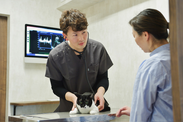 犬の場合、心疾患では僧帽弁の異常により血液の逆流が起きる僧帽弁閉鎖不全症が多く見られ、猫では心筋が肥大して血液が送れなくなる心筋症が見られるそうです。特に心筋症の初期段階では目立った症状が見られず、気付いた時には重症化しているケースもあるので、レントゲンや超音波検査、心電図などを使って緻密な検査が行われます。